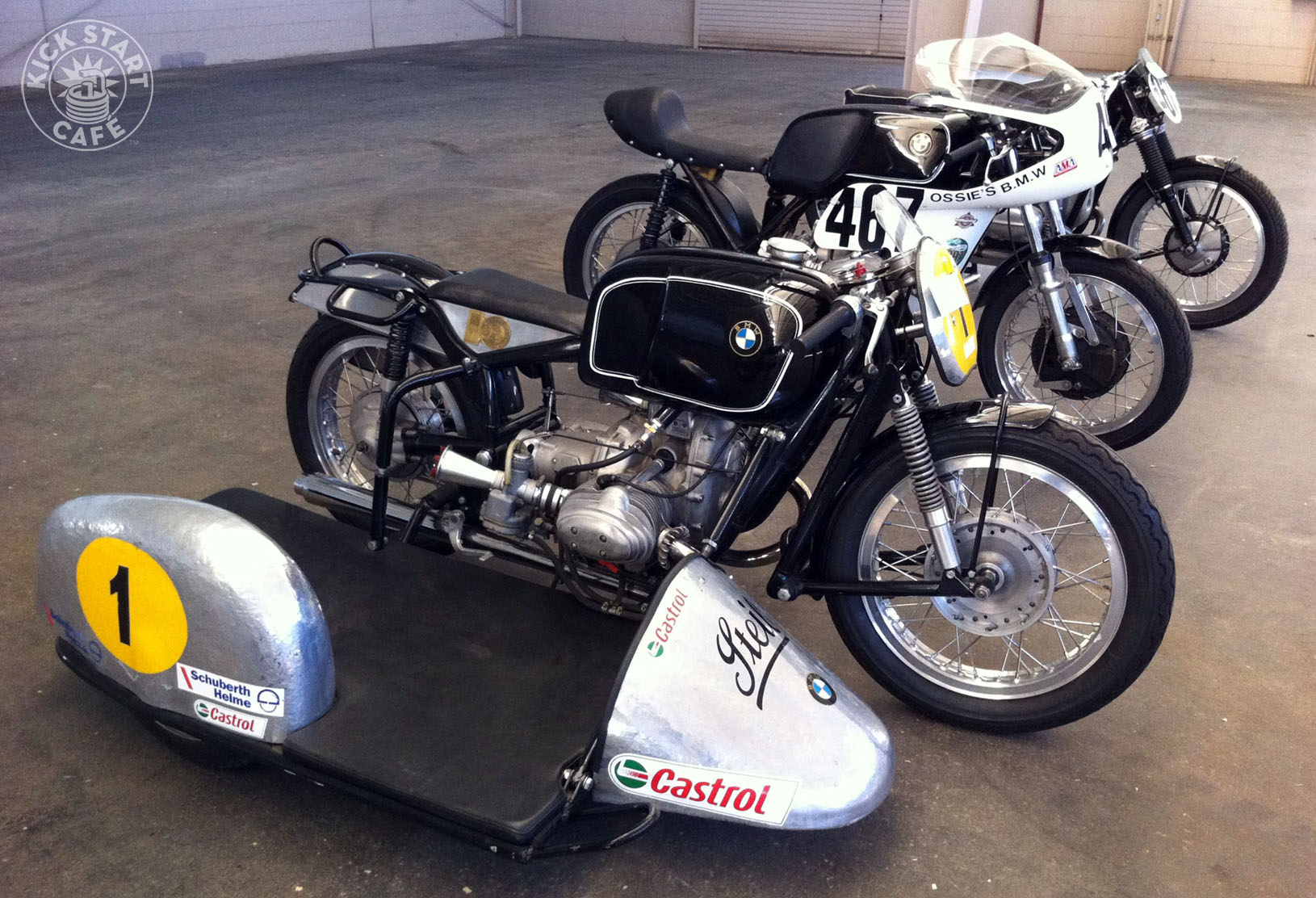 Photo by Jim Koenigsaecker Several of Ozzie Auer's vintage BMW race bikes including a 1954 RS sidecar rig.